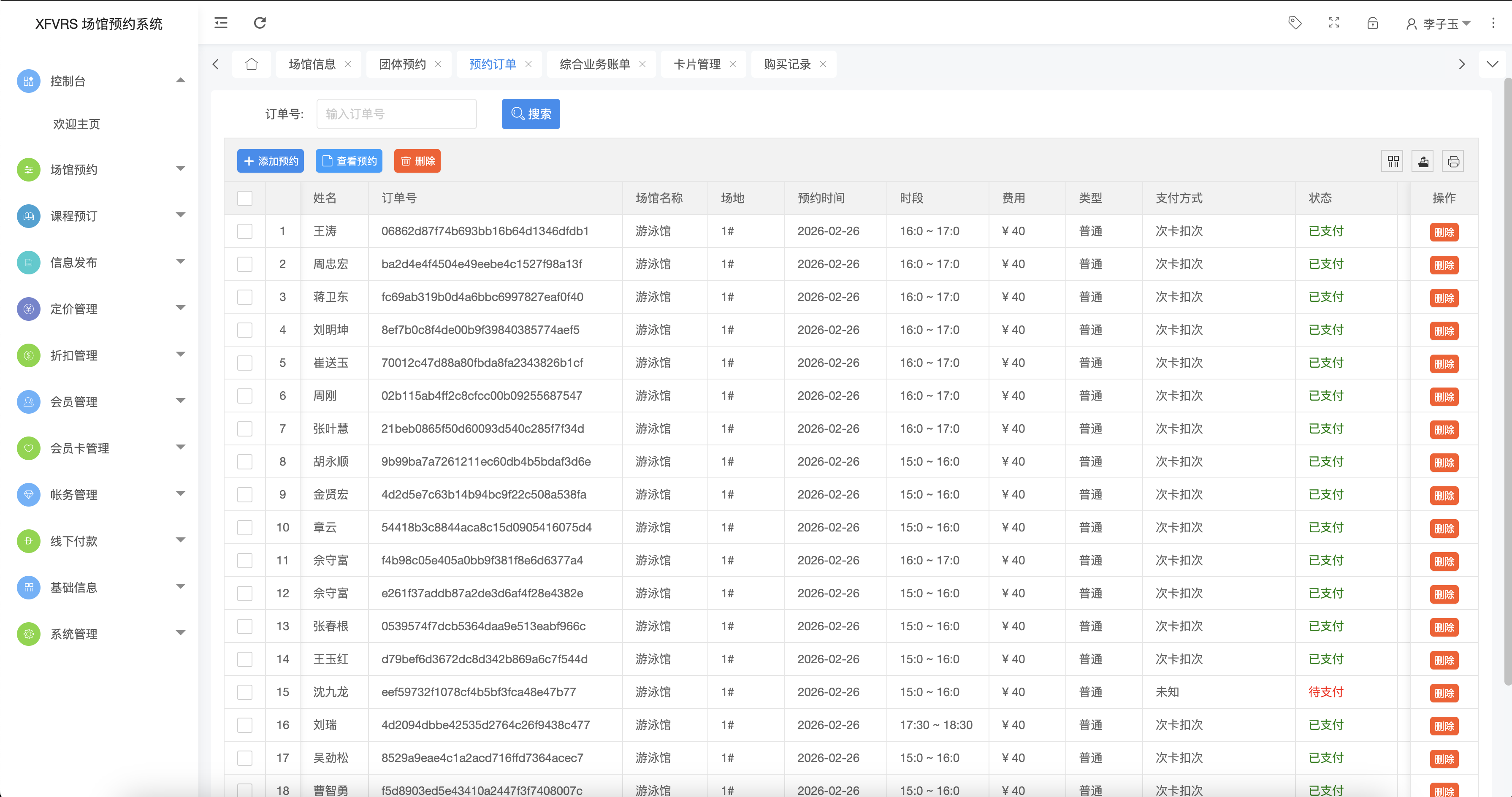 场地、会员、会员卡、预约、支付、折扣、账务管理等。