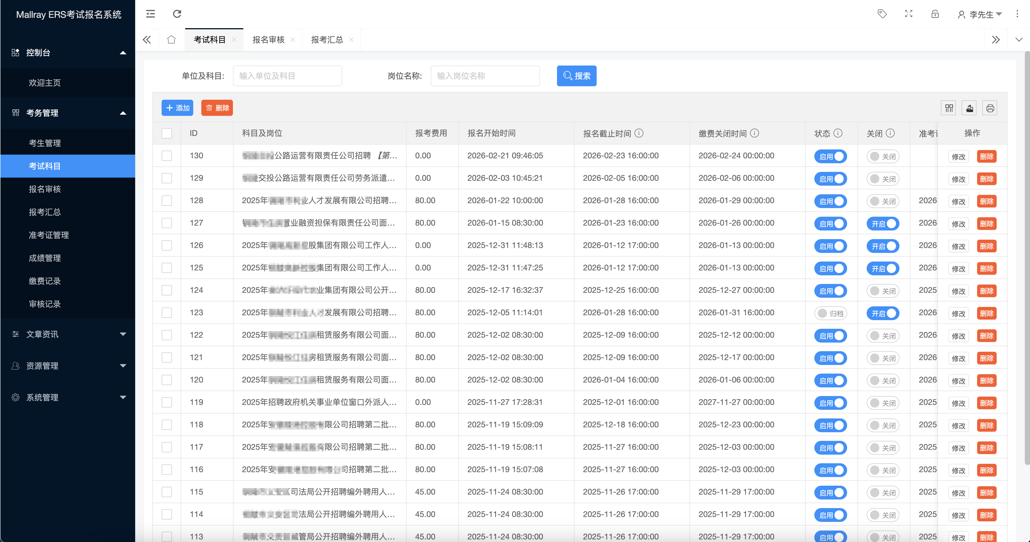 主要功能:发布、报名、缴费、准考证编排等完整闭环。